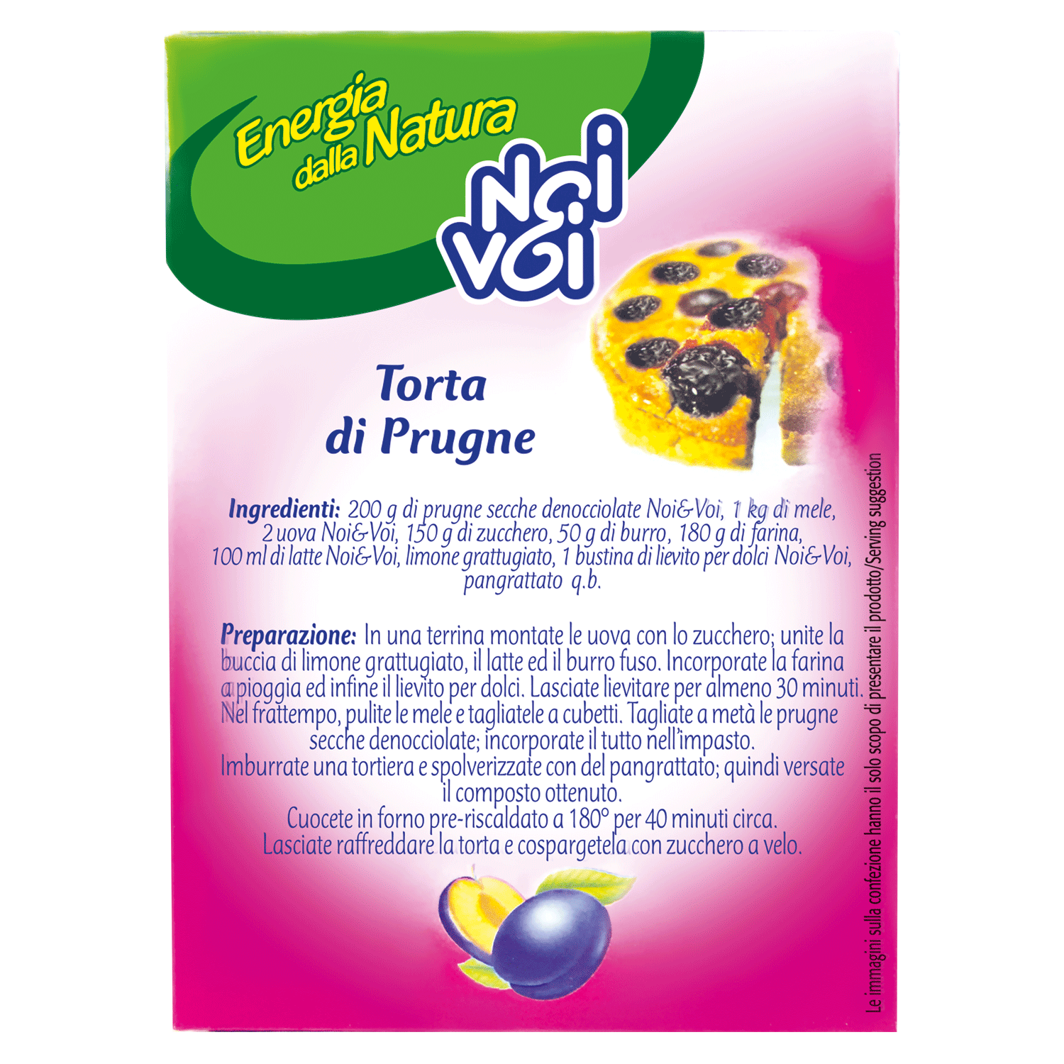 TORTA DI PRUGNE Ingredienti: 200g di prugne secche denocciolate Noi&Voi, 1 kg di mele, 2 uova Noi&Voi, 150 g di zucchero Noi&Voi, 50 g di burro Noi&Voi, 180 g di farina, 100 ml di latte Noi&Voi, limone grattugiato, 1 bustina di lievito per dolci Noi&Voi, pangrattato Noi&Voi q.b Preparazione: In una terrina montate le uova con lo zucchero; unite la buccia di limone grattugiato, il latte ed il burro fuso. Incorporate la farina a pioggia ed infine il lievito per dolci. Lasciate lievitare per almeno 30 minuti. Nel frattempo, pulite le mele e tagliatele a cubetti. Tagliate a metà le prugne secche denocciolate; incorporate il tutto nell'impasto. Imburrate una tortiera e spolverizzate con del pangrattato; quindi versate il composto ottenuto. Cuocete in forno pre-riscaldato a 180° per 40 minuti circa. Lasciate raffreddare la torta e cospargetela con zucchero a velo. | |