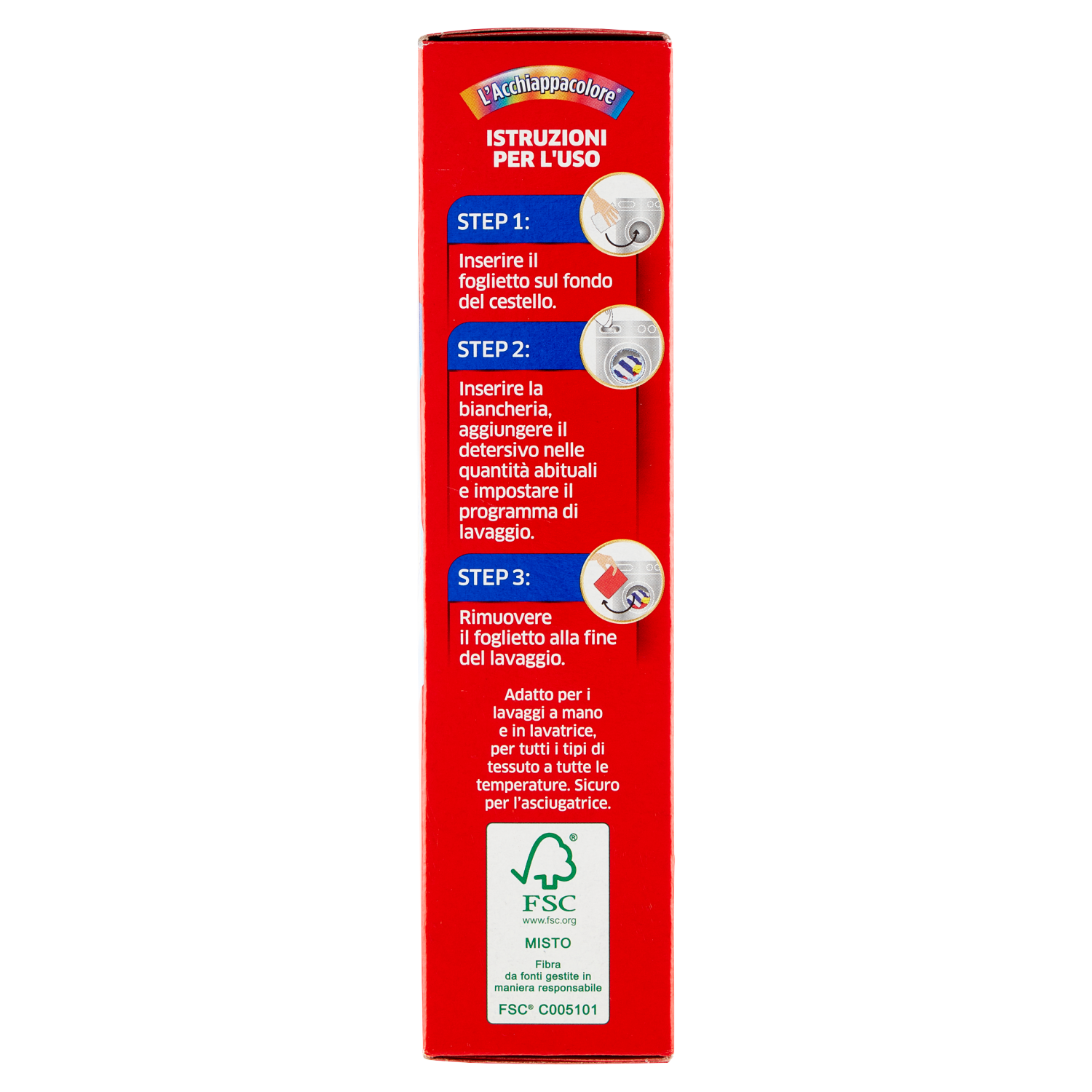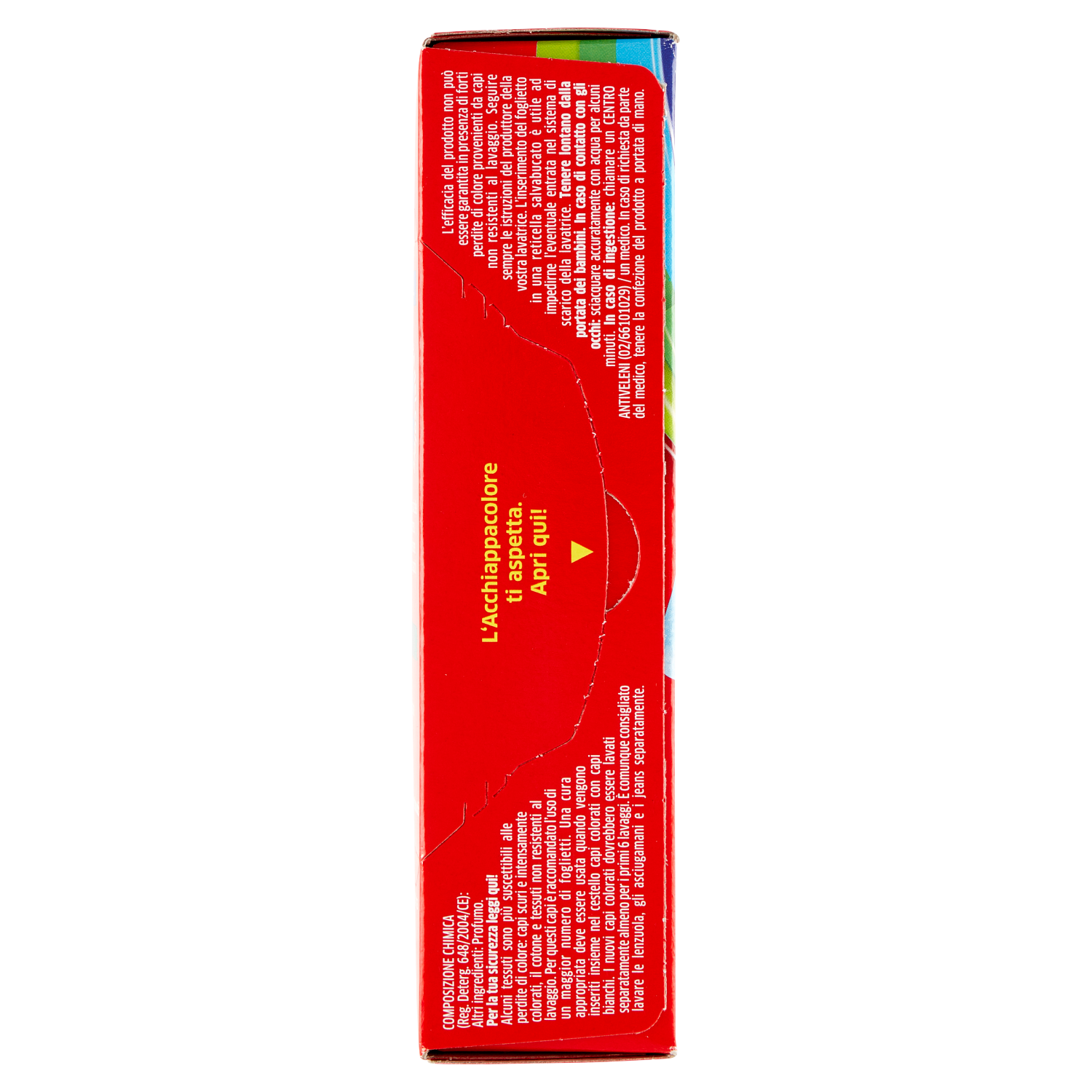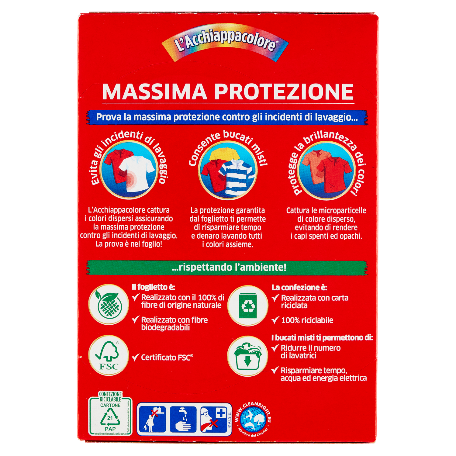 Azione completa+ Da oggi massima protezione dagli incidenti di lavaggio e più rispetto per l'ambiente! Azione completa+ Prova la migliore protezione contro gli incidenti di lavaggio... Evita gli incidenti di lavaggio Grazie alla sua tecnologia brevettata l'Acchiappacolore cattura i colori dispersi assicurando la massima protezione contro gli incidenti di lavaggio. La prova è nel foglio! Consente bucati misti La protezione garantita dal foglietto ti permette di risparmiare tempo e denaro lavando tutti i colori assieme, incluso i bianchi Protegge la brillantezza dei colori Cattura le microparticelle di colore disperso, evitando di rendere i capi spenti ed opachi Previene l'ingrigimento Protegge i capi dall'ingrigimento rimuovendo le particelle di sporco dall'acqua di lavaggio ...rispettando l'ambiente! Il foglietto è: - Realizzato con il 100% di fibre di origine naturale - Senza fibre di microplastiche - Certificato FSC La confezione è: - Realizzata con carta riciclata - 100% riciclabile I bucati misti ti permettono di: - Ridurre il numero di lavatrici - Risparmiare tempo, acqua ed energia elettrica | |
