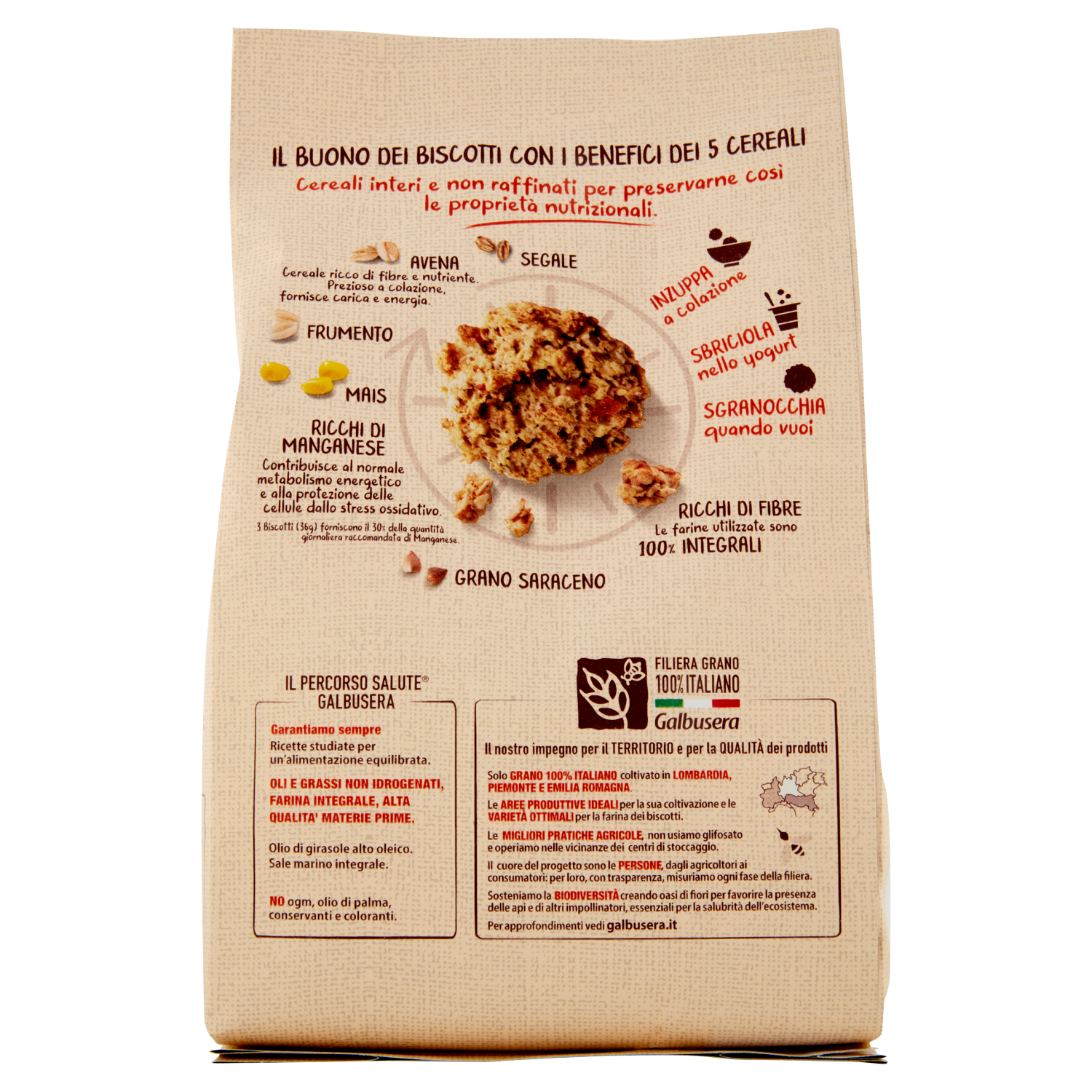 Il buono dei biscotti con i benefici dei 5 cereali Cereali interi e non raffinati per preservarne così le proprietà nutrizionali. Inzuppa a colazione Sbriciola nello yogurt Sgranocchia quando vuoi Ricchi di fibre - Le farine utilizzate sono 100% Integrali Grano saraceno Ricchi di manganese - Contribuisce al normale metabolismo energetico e alla protezione delle cellule dallo stress ossidativo. 3 Biscotti (36g) forniscono il 30% della quantità giornaliera raccomandata di Manganese. Mais Frumento Avena - Cereale ricco di fibre e nutriente. Prezioso a colazione, fornisce carica e energia. Segale Il Percorso Salute Galbusera Garantiamo sempre Ricette studiate per un'alimentazione equilibrata. Oli e grassi non idrogenati, farina integrale, alta qualità materie prime. Olio di girasole alto oleico. Sale marino integrale. No ogm, olio di palma, conservanti e coloranti. | |