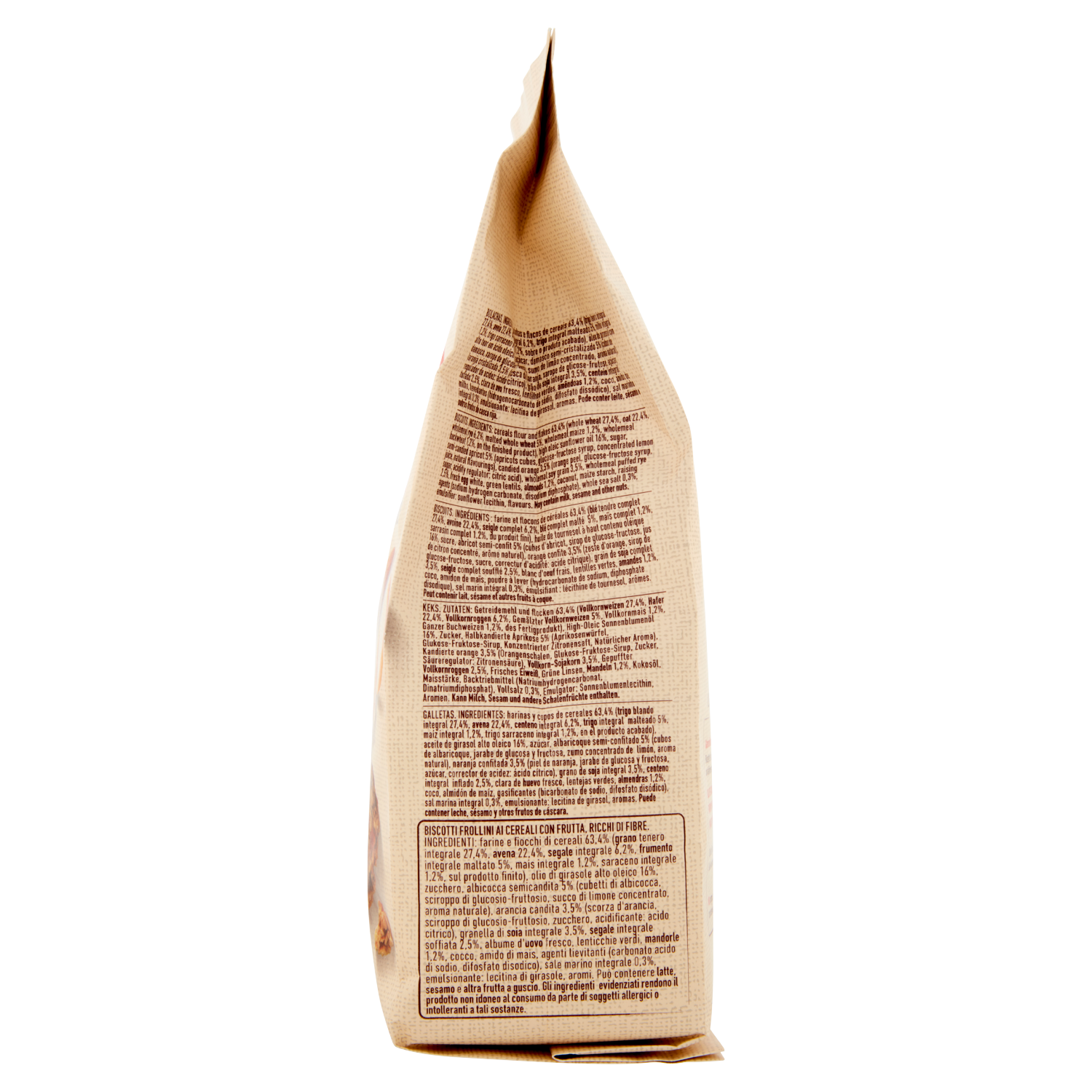 Ingredienti | Farine e fiocchi di cereali 63,4% (grano tenero integrale 27,4%, avena 22,4%, segale integrale 6,2%, frumento integrale maltato 5%, mais integrale 1,2%, saraceno integrale 1,2%, sul prodotto finito) Olio di girasole alto oleico 16% Zucchero Albicocca semicandita 5% (cubetti di albicocca, sciroppo di glucosio-fruttosio, succo di limone concentrato, aroma naturale) Arancia candita 3,5% (scorza d'arancia, sciroppo di glucosio-fruttosio, zucchero, acidificante: acido citrico) Granella di soia integrale 3,5% Segale integrale soffiata 2,5% Albume d'uovo fresco Lenticchie verdi Mandorle 1,2% Cocco Amido di mais Agenti lievitanti (carbonato acido di sodio, difosfato disodico) Sale marino integrale 0,3% Emulsionante: lecitina di girasole Aromi Può contenere latte, sesamo e altra frutta a guscio |