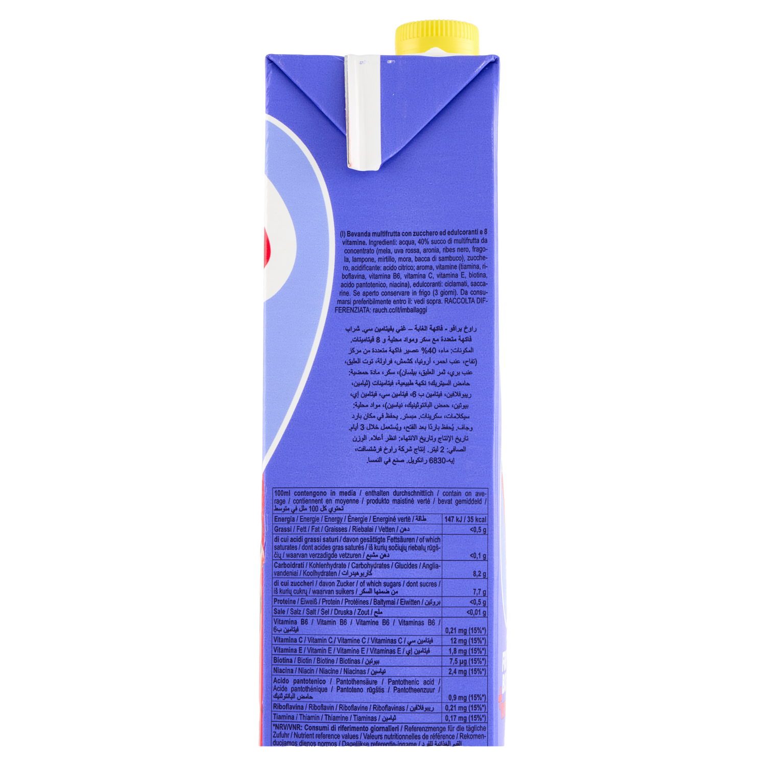 Ingredienti | Acqua 40% Succo di multifrutta da concentrato (mela, uva rossa, aronia, ribes nero, fragola, lampone, mirtillo, mora, bacca di sambuco) Zucchero Acidificante: acido citrico Aroma Vitamine (tiamina, riboflavina, vitamina B6, vitamina C, vitamina E, biotina, acido pantotenico, niacina) Edulcoranti: ciclamati, saccarine |