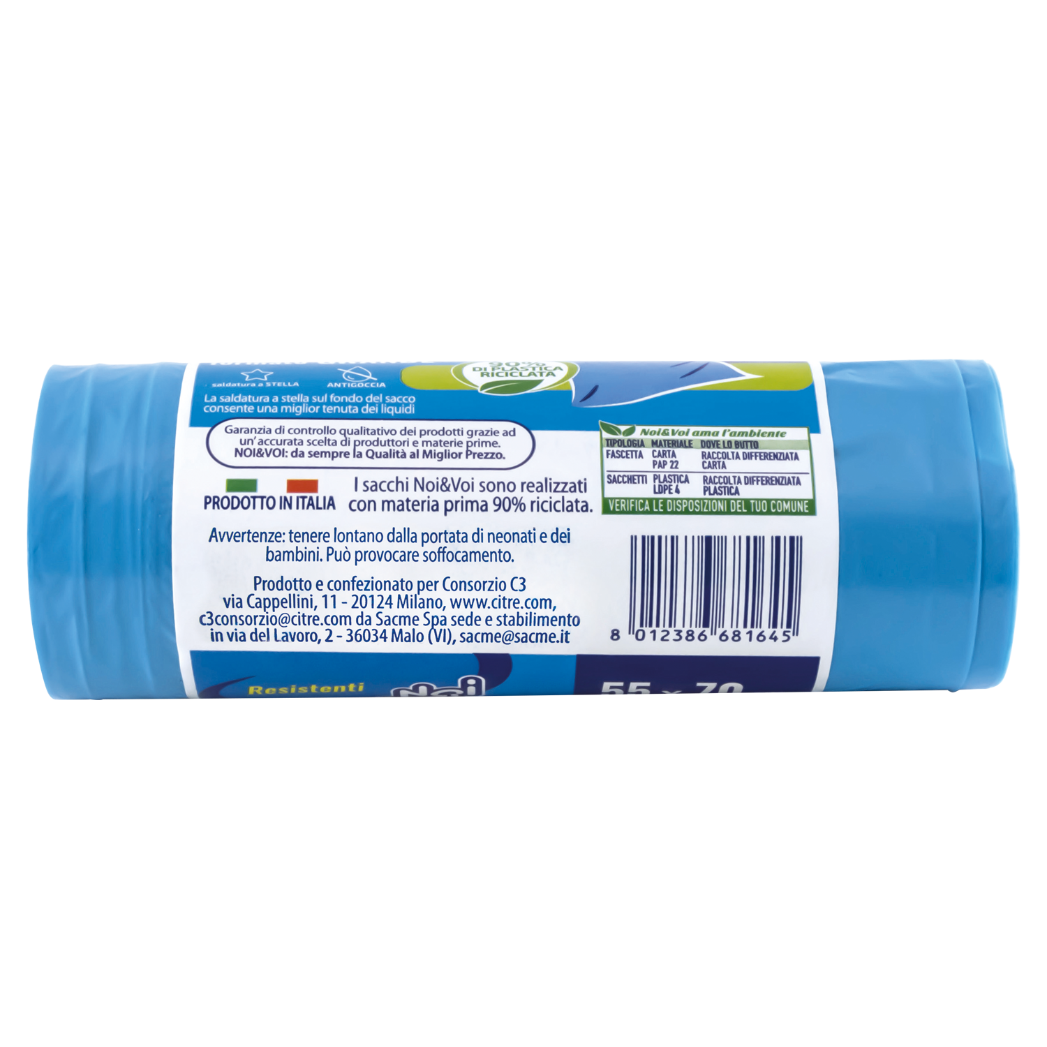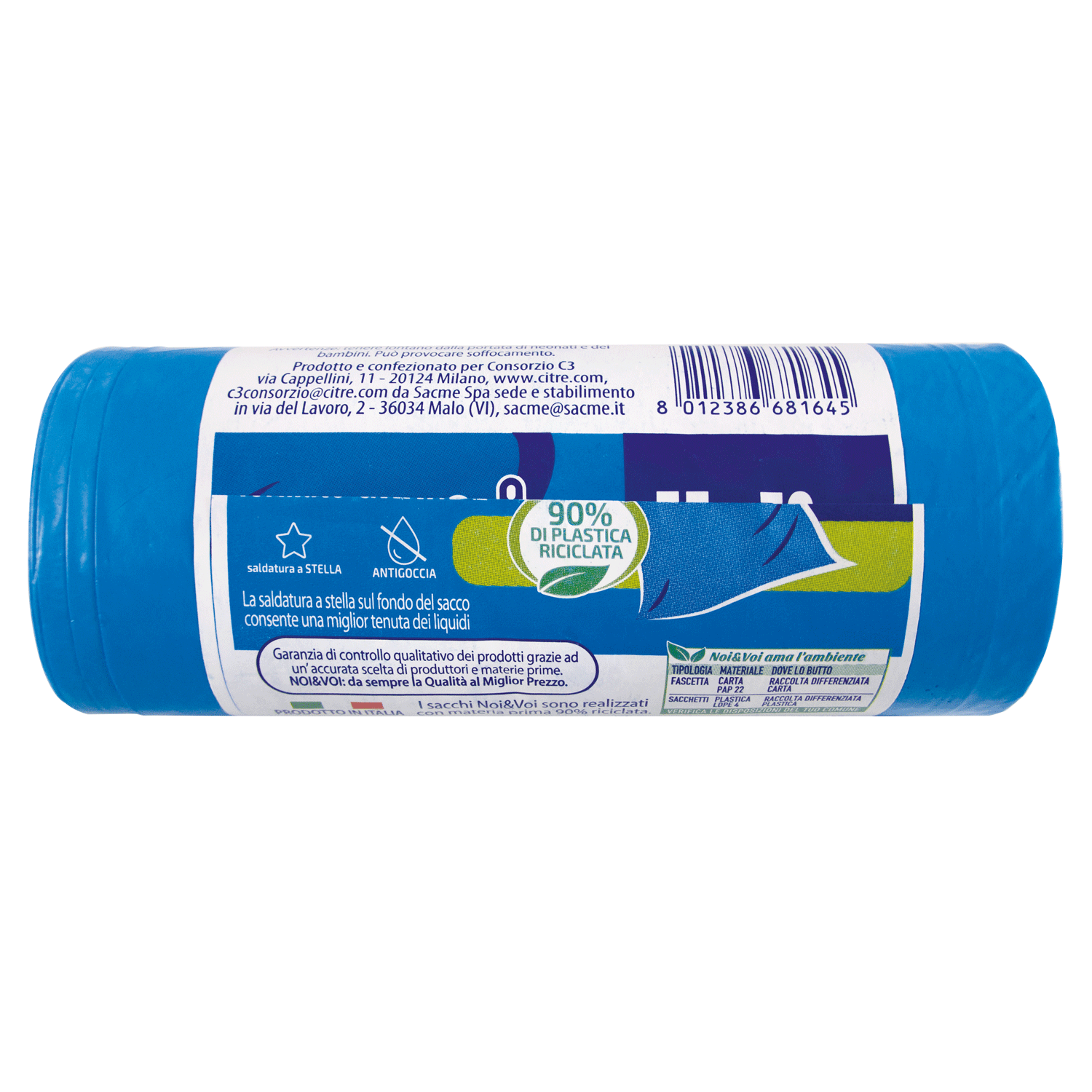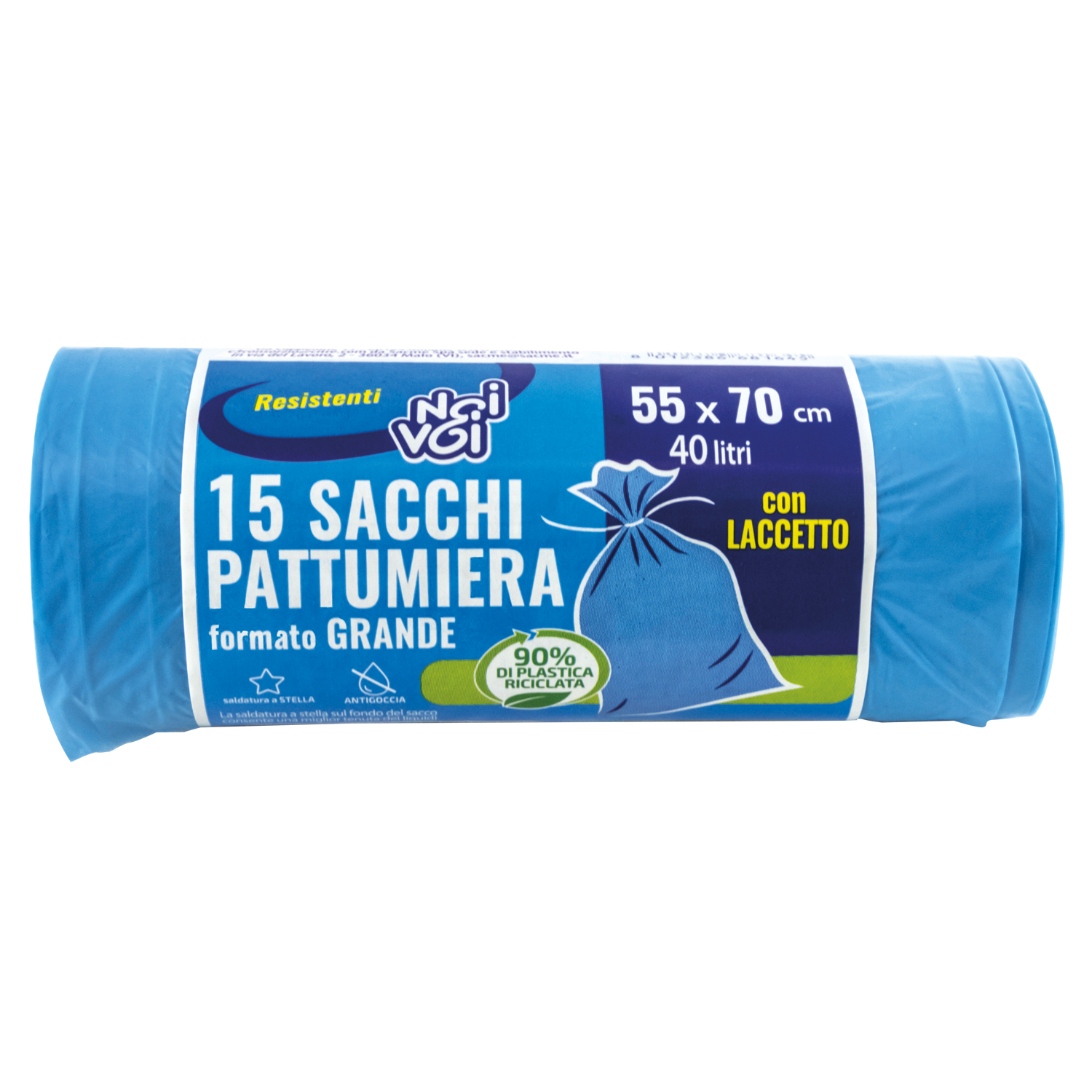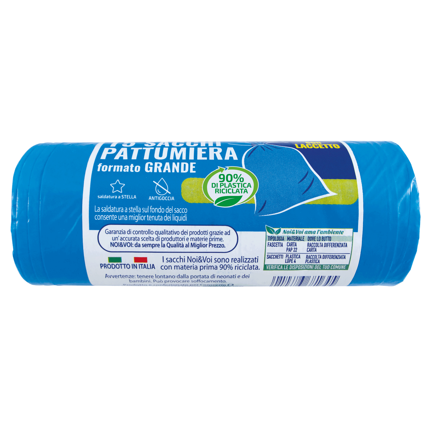 Con Laccetto Saldatura a Stella La saldatura a stella sul fondo del sacco consente una miglior tenuta dei liquidi Antigoccia 90% DI PLASTICA RICICLATA I sacchi Noi&Voi sono realizzati con materia prima 90% riciclata. PRODOTTO IN ITALIA | |