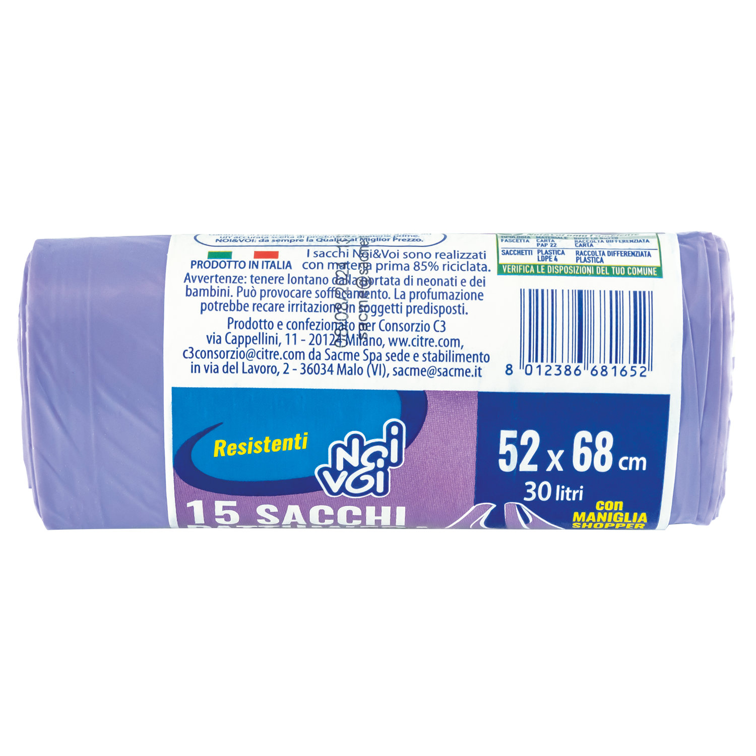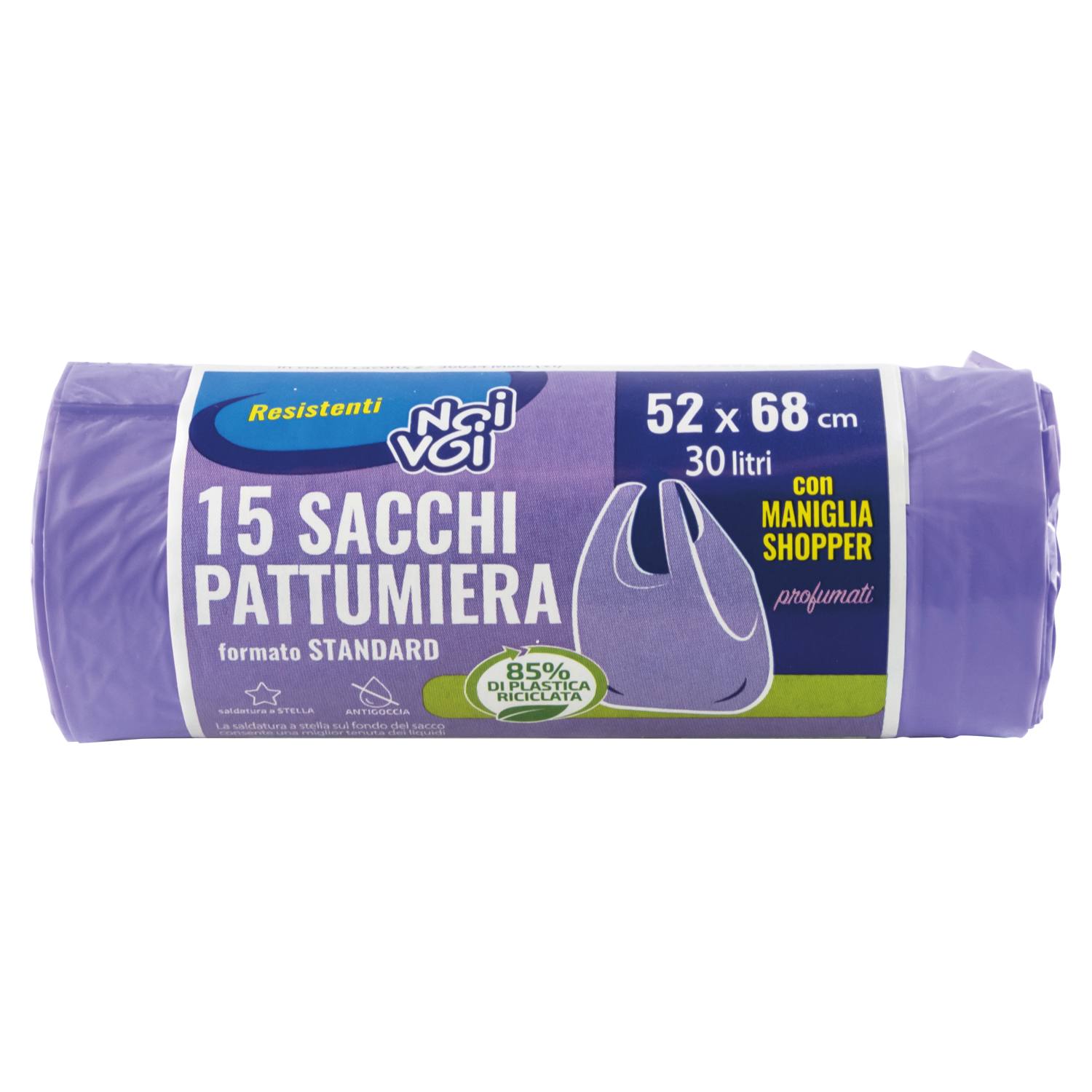 Con Maniglia shopper Profumati Saldatura a Stella La saldatura a stella sul fondo del sacco consente una miglior tenuta dei liquidi Antigoccia 85% DI PLASTICA RICICLATA I sacchi Noi&Voi sono realizzati con materia prima 85% riciclata. PRODOTTO IN ITALIA | |
