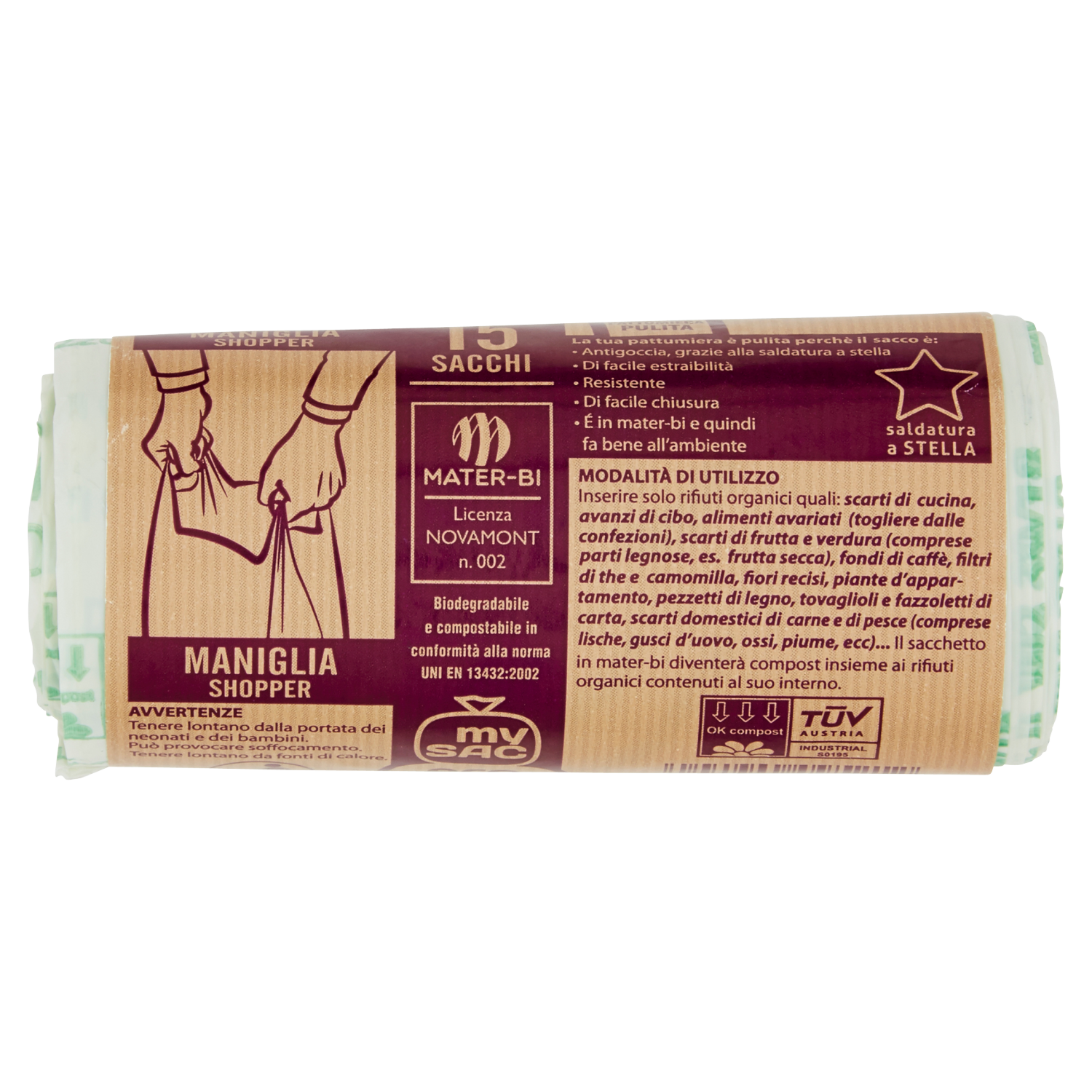 Caratteristiche | Per la raccolta differenziata dell'umido 15 Sacchi resistenti Maniglia shopper Biodegradabili e compostabili Made in Italy |